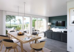 Kleines Grundstück für große Wohnträume? Dann ist der kompakte Doppelhaus-Entwurf CELEBRATION 122, der mit rund 7,40 x 10 Metern Grundfläche auskommt, genau die richtige Lösung. Die offene Raumeinheit für Kochen, Essen und Wohnen im Erdgeschoss präsentiert sich überraschend großzügig, und im zweiten Geschoss finden Sie genügend Raum für Ihren persönlichen Rückzugsbereich. Falls noch mehr Wohnraum gewünscht wird, lässt sich dieses Eigenheim ganz einfach durch ein drittes Geschoss erweitern. Verschiedene Eingangssituationen, unterschiedliche Dachvarianten und zahlreiche Architekturbauteile machen das CELEBRATION 122 zum Verwandlungskünstler für Ihr höchst individuell gestaltetes Eigenheim.