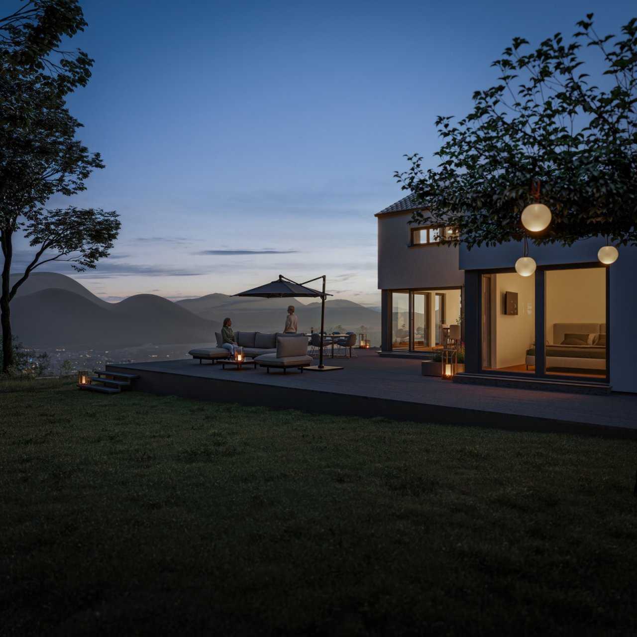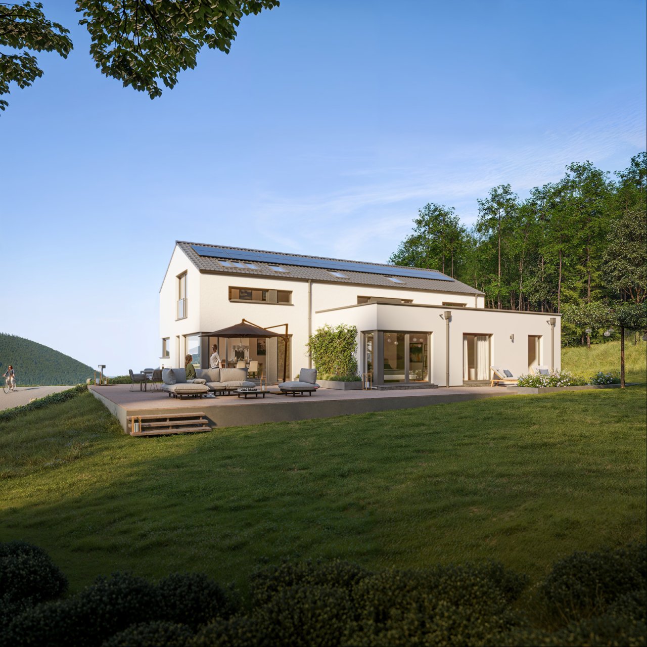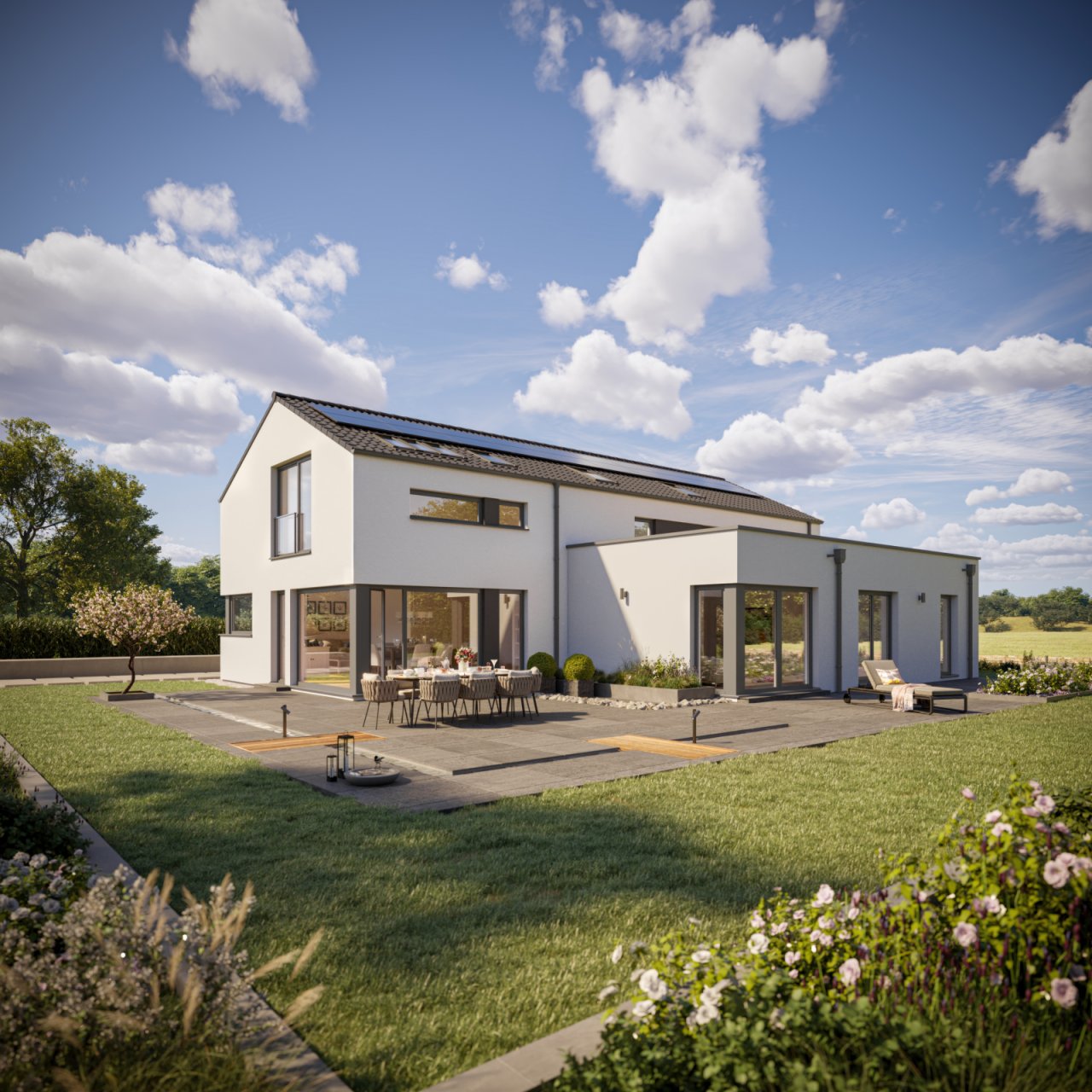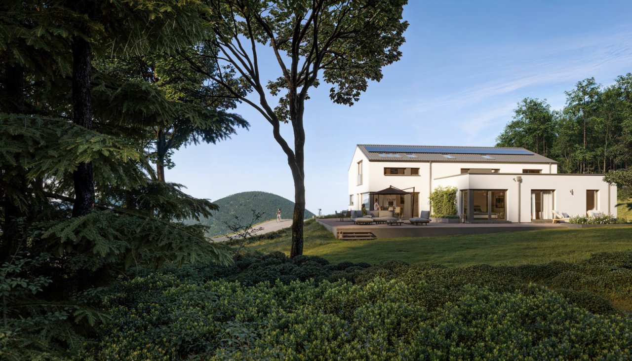 Modern, geradlinig, stilvoll – so präsentiert sich das Celebration CELEBRATION 274 V3 seinen Betrachtern. Nur die pure Größe lässt erahnen, dass es sich bei dem Gebäude um ein Zweifamilienhaus mit zwei horizontal getrennten Wohneinheiten handelt. Blickfang sind – neben dem großzügigen Flachdachanbau – vor allem die Lichtöffnungen, die von schmalen Lichtbändern im Obergeschoss bis hin zu bodentiefen Übereckverglasungen reichen. Gekrönt wird das Fertighaus von einem eleganten Satteldach. Der Verzicht auf Dachüberstände betont den modernen Charakter des Hauses. Die langgestreckte Dachfläche ist wie geschaffen für eine leistungsstarke Photovoltaikanlage als Ergänzung zur effizienten Heiztechnik. Gekoppelt mit einer Wärmepumpe lässt sich das Haus fast komplett autark mit Wärme versorgen. Es ist natürlich auch möglich, einen Speicher und/oder eine Wallbox für das Elektrofahrzeug zu installieren.…
