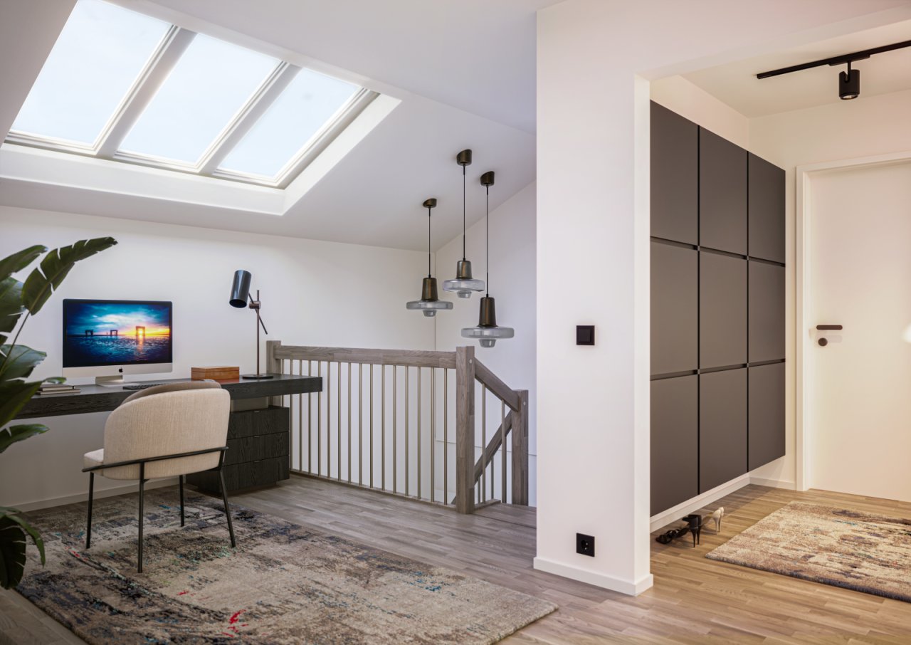 Das Innere des Hauses teilt sich in zwei unterschiedlich große Wohneinheiten. Die untere Wohnung umfasst rund 141 m². Sie bietet viel Freiraum für eine Familie mit bis zu zwei Kindern. Die obere Wohnung ist mit einer Wohnfläche von rund 122 m² perfekt auf einen Zwei- bis Dreipersonenhaushalt ausgerichtet. Der Grundriss wurde auf beiden Ebenen weitgehend offen gestaltet. Im Zentrum des Alltagsgeschehens steht jeweils der Wohn-, Ess- und Kochbereich, der im Erdgeschoss von einer Speisekammer und im Dachgeschoss von einem Abstellraum flankiert wird. Die Privaträume setzen sich auf der unteren Ebene aus zwei Kinderzimmern, einem Duschbad sowie dem Bereich der Eltern mit Ankleide und Wohlfühlbad zusammen. Im Dachgeschoss bieten zwei ähnlich geschnittene Schlafzimmer, ein großer Ankleidebereich und zwei Bäder Luxus pur. Zusätzliche Platzreserven finden sich auf der Galerie, auf dem sich die Bewohner beispielsweise einen hellen Arbeitsplatz oder einen gemütlichen Lesebereich einrichten können. Ergänzt wird das Raumangebot von einem Technikraum, der von beiden Parteien genutzt wird.