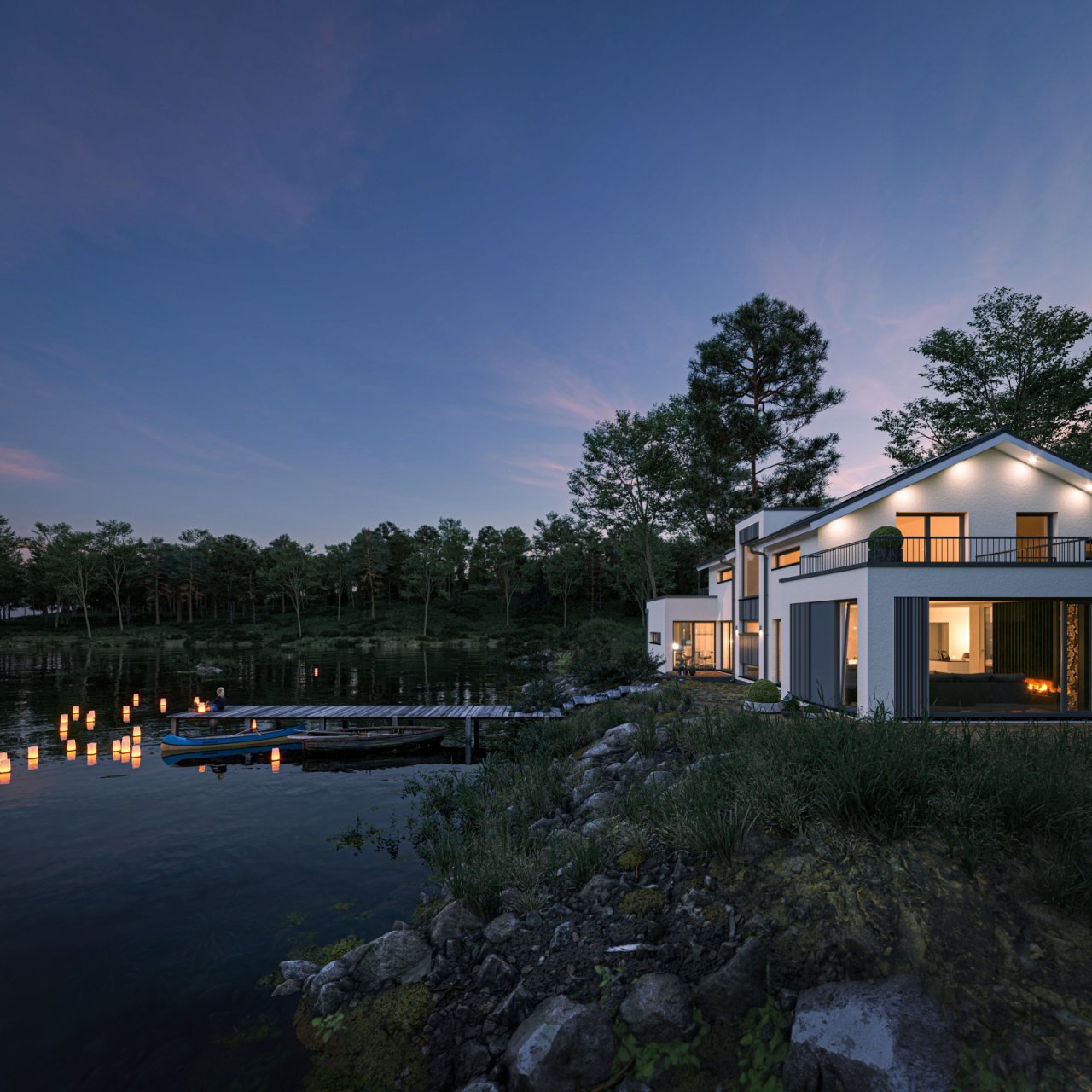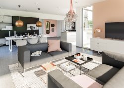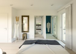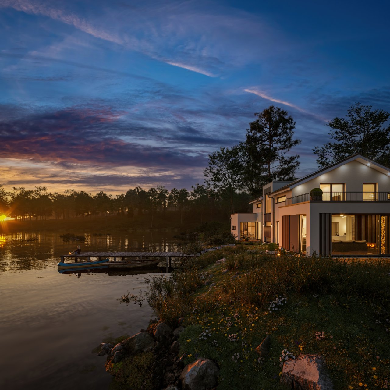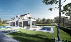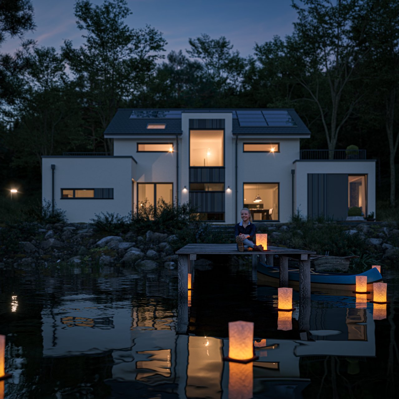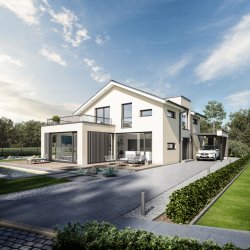 Das Bien-Zenker Musterhaus in der FertighausWelt Hannover aus der Hauslinie CONCEPT-M ist in jedem Neubaugebiet ein absoluter Hingucker: Mit modern interpretierter Satteldacharchitektur und additiven kubischen Baukörpern für Lichterker, Carport und Dachbalkonen, die das unbeschwerte Leben auf ein hohes Level heben. Wahrlich eindrucksvoll präsentiert sich auch das Innere. Der lichtdurchflutete Koch-Ess-Wohnbereich mit seinen bodentiefen Fenstern geht offen über in eine einladende Diele, der sich ein Flur anschließt, welcher in den Homeoffice-Trakt führt. Für ein Leben auf hohem Niveau ist auch das Obergeschoss konzipiert, das alles bietet, was eine Familie zum Wohnen braucht. Ein Smart-Home also, innovativ in Gestaltung und Haustechnik für höchsten Wohnkomfort.