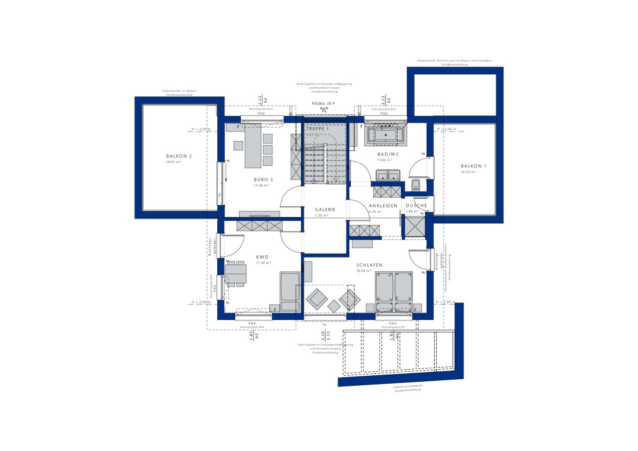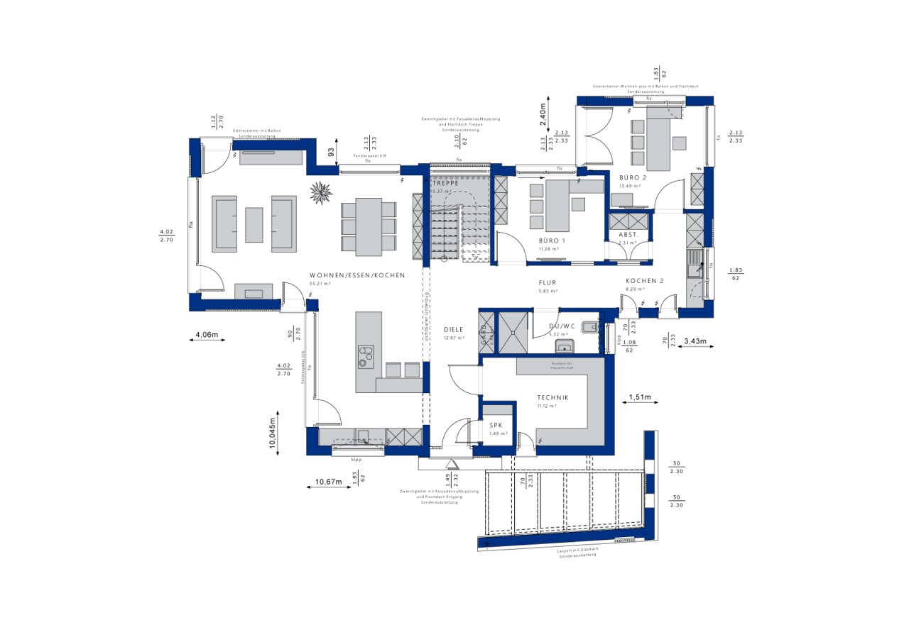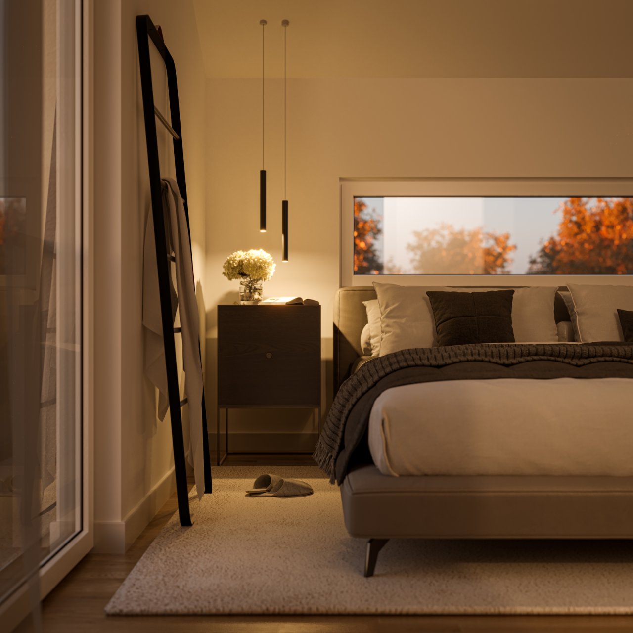 Das Bien-Zenker Musterhaus in der FertighausWelt Hannover aus der Hauslinie CONCEPT-M ist in jedem Neubaugebiet ein absoluter Hingucker: Mit modern interpretierter Satteldacharchitektur und additiven kubischen Baukörpern für Lichterker, Carport und Dachbalkonen, die das unbeschwerte Leben auf ein hohes Level heben. Wahrlich eindrucksvoll präsentiert sich auch das Innere. Der lichtdurchflutete Koch-Ess-Wohnbereich mit seinen bodentiefen Fenstern geht offen über in eine einladende Diele, der sich ein Flur anschließt, welcher in den Homeoffice-Trakt führt. Für ein Leben auf hohem Niveau ist auch das Obergeschoss konzipiert, das alles bietet, was eine Familie zum Wohnen braucht. Ein Smart-Home also, innovativ in Gestaltung und Haustechnik für höchsten Wohnkomfort.