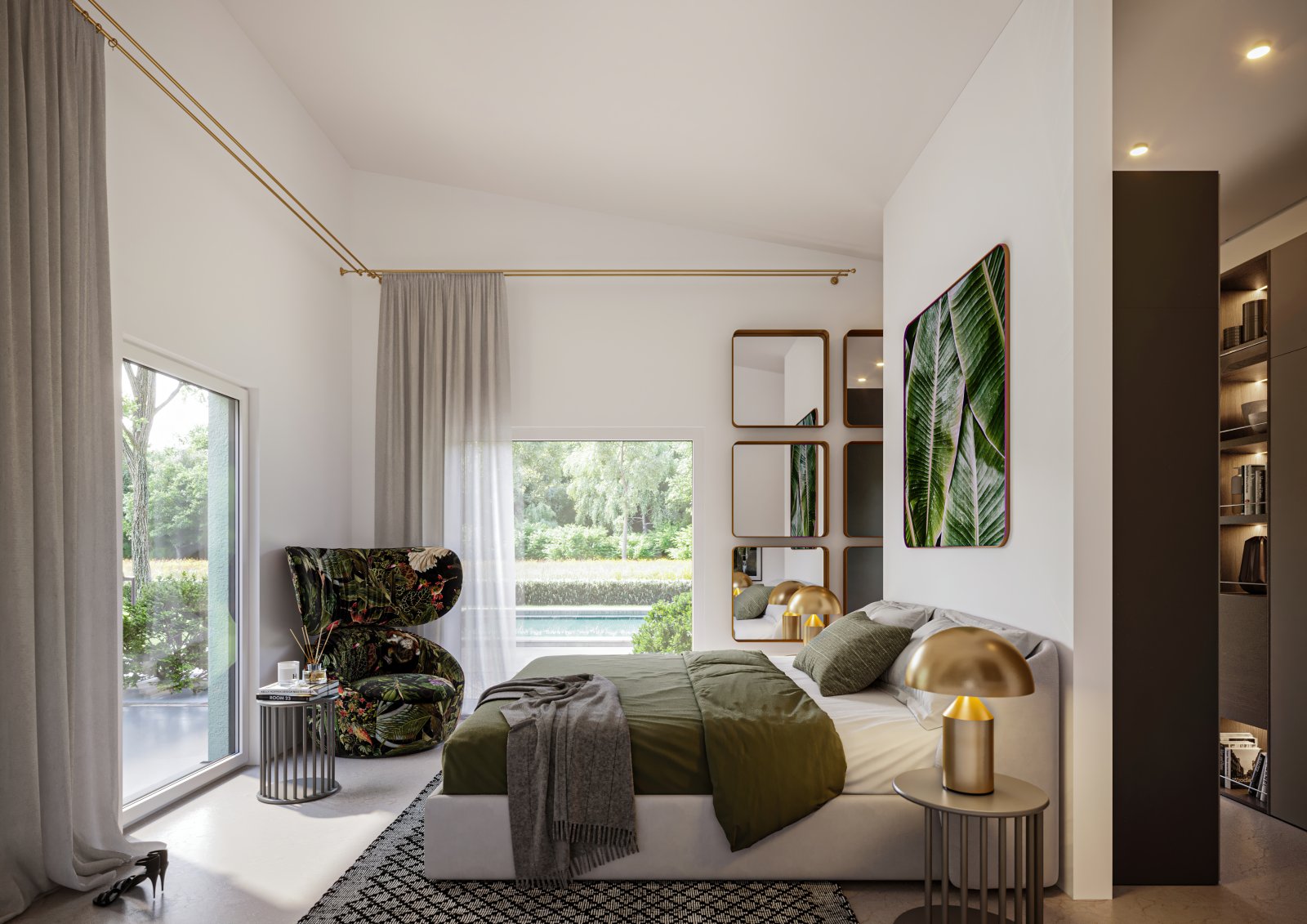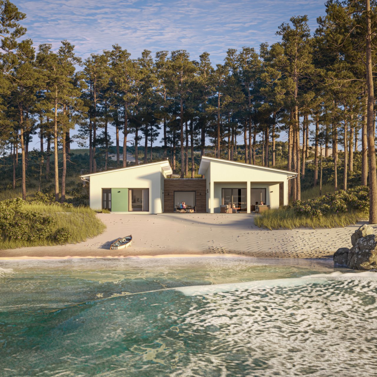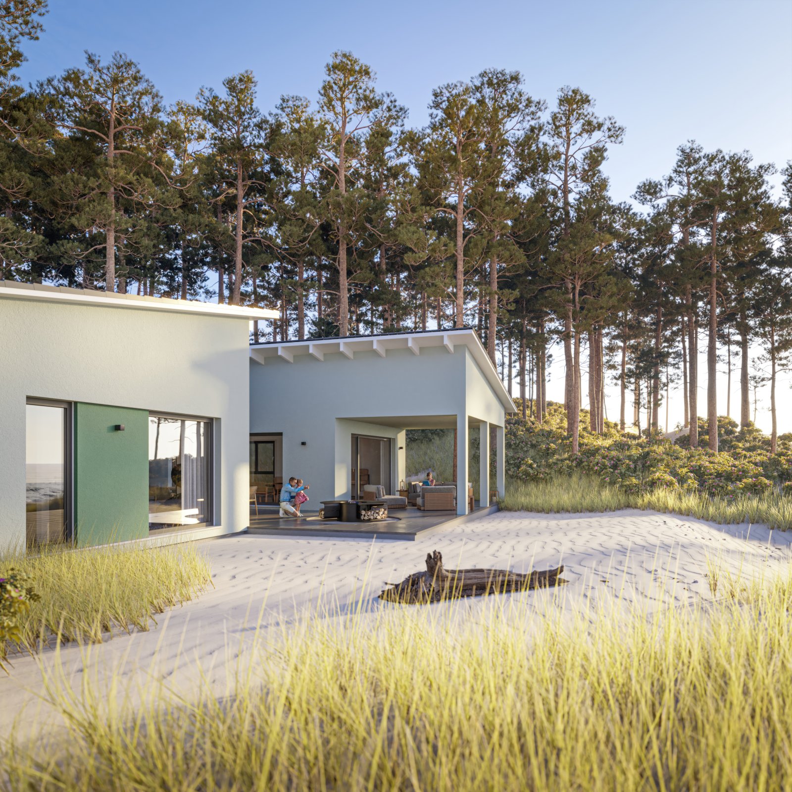 Der außergewöhnliche Bungalow AMBIENCE 162 von Bien-Zenker vereint modernes Design mit durchdachter Funktionalität und bietet Ihnen die Freiheit, Ihr neues Zuhause nach Ihren Vorstellungen zu gestalten. Die offene U-Form des Hauses schafft ein einladendes Ambiente, das durch lichtdurchflutete Räume noch verstärkt wird. Der linke Flügel beherbergt großzügige Gemeinschaftsbereiche, die perfekt für gesellige Abende oder entspannte Stunden im Kreise der Liebsten geeignet sind. Praktische Details wie eine Speisekammer ergänzen den Bereich ideal. Auf der rechten Seite des Bungalows befinden sich die Privaträume: zwei behagliche Schlafzimmer und ein luxuriöses Wellnessbad, das Ihnen eine Oase der Ruhe bietet. Ein zusätzliches Büro sowie ein Technikraum und Gästebad runden das Konzept ab und machen den Bungalow zu einem perfekten Rückzugsort für Familien oder Paare.