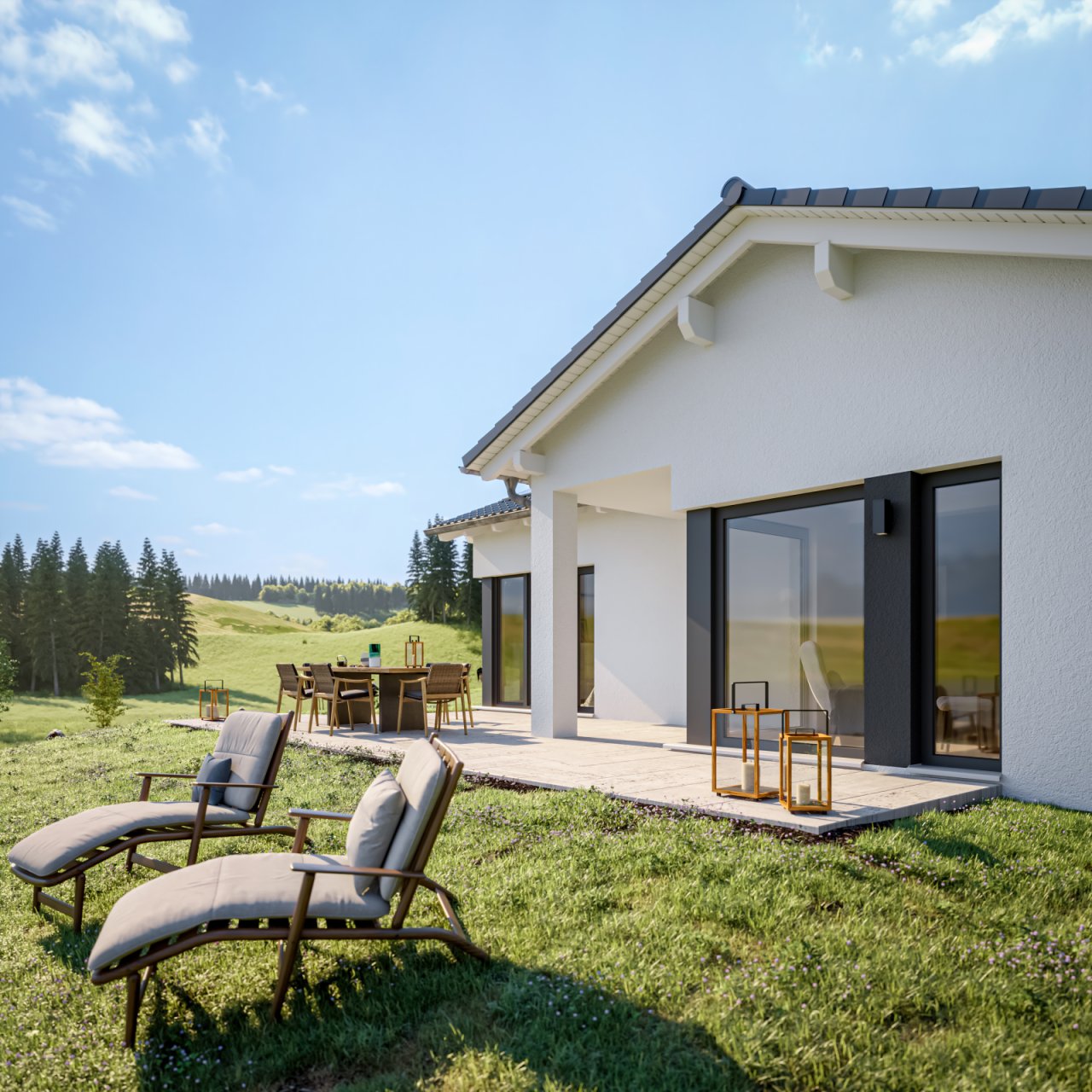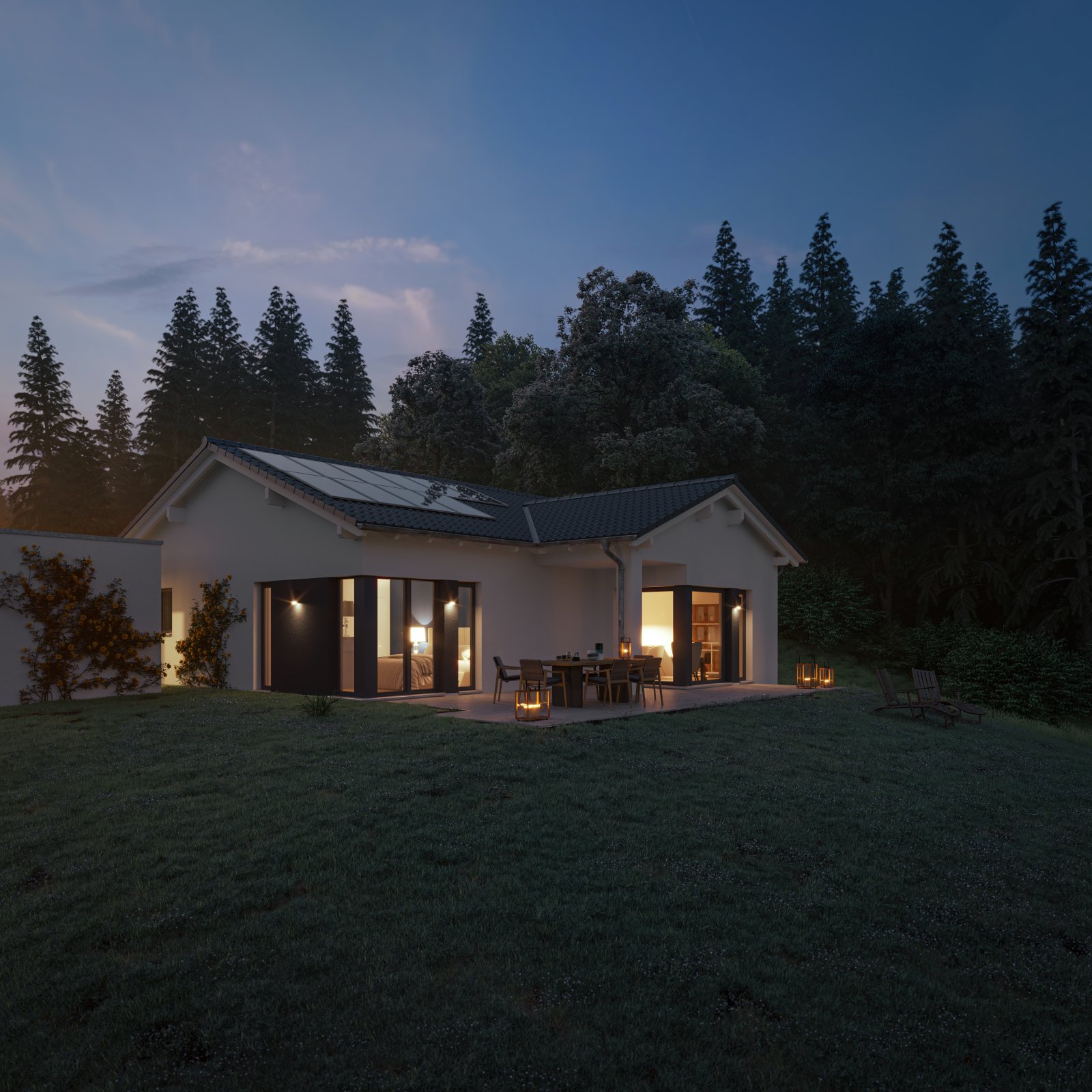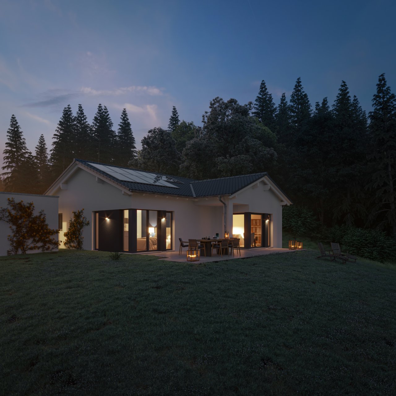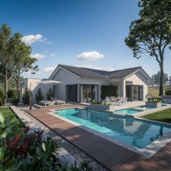 Der Bungalow erlebt eine Renaissance. Unser „AMBIENCE 77“ ist wie geschaffen für zwei Personen, die das ebenerdige Wohnen in vollen Zügen genießen möchten. Stilsicher prägen die unterschiedlichen Dachformen Sattel-, Walm- und Flachdach die architektonische Vielfalt der einzelnen Varianten. Ob mit Querhaus oder Übereck-Erker für einen überdachten Freisitz oder einem Übereck-Panorama-Erker samt anschließender Gartenlounge: Diese Bungalows vereinen Architektur und Funktionalität in ganz besonderer Weise. Kompakt in den Außenmaßen, passen sich die Bungalows jedem Grundstück perfekt an. Und die rund 77 Quadratmeter Wohnfläche lassen keine Wohnwünsche offen.