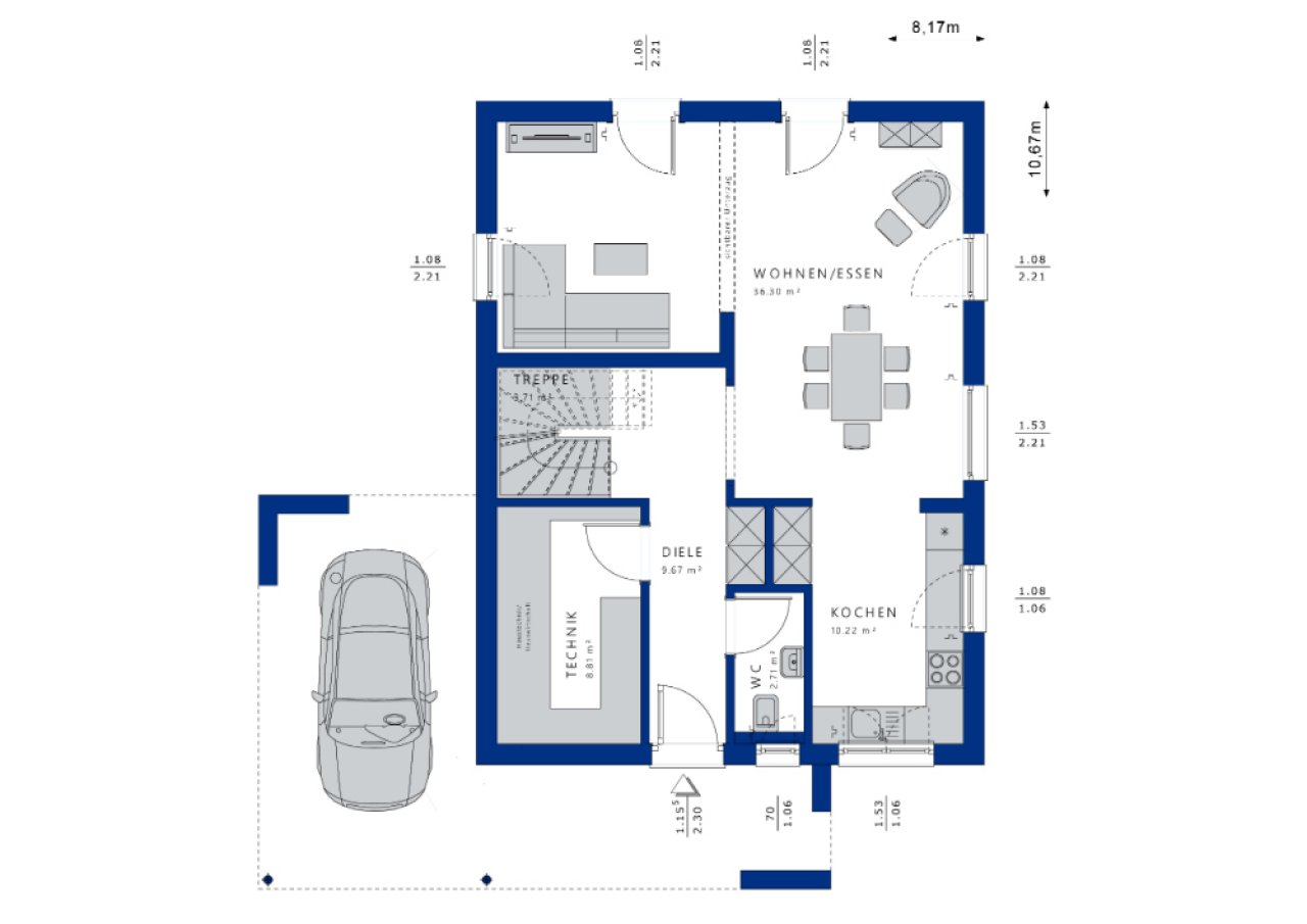 Von außen ein zeitlos schönes Design, im Innern viel Platz für eine vierköpfige Familie: Was braucht es mehr, um glücklich zu sein? Diese elegante Stadtvilla strahlt ihren Betrachtern mit ihrer weißen Putzfassade schon von Weitem entgegen. Im Kontrast dazu steht das dunkel eingedeckte Walmdach, das im grauen Design-Carport eine perfekte Ergänzung findet. Das Dach des Carports wird im weiteren Verlauf zur praktischen Eingangsüberdachung. Egal ob es regnet oder schneit: Die Bewohner gelangen stets trockenen Fußes ins Haus. Im Innern werden sie von einer geräumigen Diele mit Garderobenbereich empfangen, an die sich links ein Gäste-WC und rechts ein Technik- bzw. Hauswirtschaftsraum anschließen. Letzterer beherbergt nicht nur die Heizungsanlage, Waschmaschine, Trockner und Co., sondern stellt außerdem Lagerfläche für all die Dinge, die man nicht täglich benötigt, bereit. So funktioniert das Fertighaus auch ohne Keller sehr gut! Die Diele endet an der halbgewendelten Treppe, die sich stilvoll in die Höhe schraubt. Gegenüber befindet sich der L-förmig angelegte Wohn-, Ess- und Kochbereich, der mit seiner Weite beeindruckt. Bodentiefe Fenster lassen große Mengen Tageslicht einströmen und unterstreichen so das luftige Ambiente. Zwischen die Couchlandschaft und die Küche kann ein großer Esstisch gestellt werden, an dem Besuch und Familie bequem Platz finden. Hier lässt man sich gerne nieder – nicht nur zum Speisen, sondern vielleicht auch für das ein oder andere Brettspiel. Die Wandnische in der Küche bietet sich für hohe Einbauschränke an. Grifflose Fronten sorgen dafür, dass sie fast unsichtbar mit der Wand verschmelzen. Hinsichtlich des Bewegungsfreiraums steht das Obergeschoss dem Erdgeschoss in nichts nach. Um eine mittig platzierte, helle Empore gruppieren sich zwei gleich große Kinderzimmer, ein eigenes Kinderbad mit Dusche, das Elternschlafzimmer mit integriertem Ankleidebereich und das Familienbad mit Wanne und Walk-in-Dusche. Noch mehr Komfort zieht nur mit einem Smart Home-Paket ein.