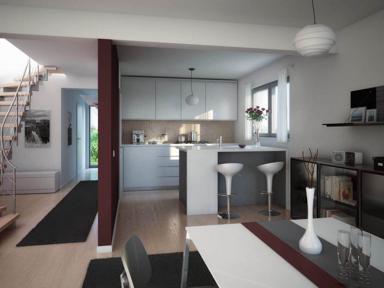 Links liegt der Technik- bzw. Hauswirtschaftsraum. Mit knapp 9 m² bietet er nicht nur ausreichend Platz für die Haus- und Heiztechnik, sondern auch für all die Dinge, die nur selten benötigt werden wie etwa die Skiausrüstung. Ein Keller ist damit nicht zwingend notwendig. Offen geht die Diele in das Treppenhaus über. Gerade Familien mit Kindern im Teenageralter werden diese Lösung zu schätzen wissen: Zum einen steht der Nachwuchs nicht dauerhaft unter Beobachtung, zum anderen stört das ständige Treppauf und Treppab nicht das Wohngeschehen. Der Alltag der Bewohner spielt sich hauptsächlich im Wohn-, Ess- und Kochbereich ab, der über bodentiefe Fenstertüren in ein sonniges Ambiente getaucht wird. Die Küche besitzt einen eigenen Zugang zum Flur. Unter dem Dach liegen die privaten Ruhe- und Rückzugsbereiche. Um eine luftige Empore gruppieren sich zwei große Kinderzimmer, ein Schlafraum mit vorgelagertem Ankleidebereich und ein gemütliches Bad mit Wanne und Dusche, das über ein Dachflächenfenster zusätzlich mit Tageslicht versorgt wird.
